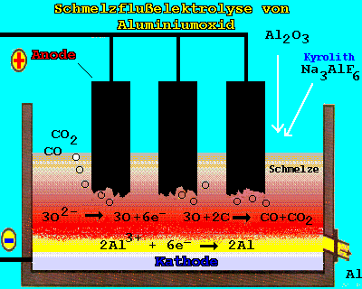 2O3 = Aluminiumoxid) umgewandelt wird. Um den Schmelzpunkt möglichst niedrig zu halten, setzt man dem Aluminiumoxid Kyrolith (Na3AlF6) hinzu. Damit kann die Elektrolyse bei 950°C durchgeführt werden.
